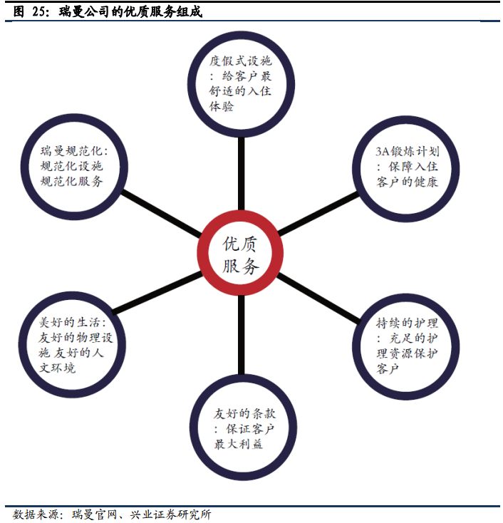 优质全面的养老服务是瑞曼的核心竞争力。养老社区形式上是“房地产运作+养老服务”的模式,但本质是它仍是服务业,“房地产运作”只是它骨架,灵魂仍然是优质的服务。瑞曼公司优质服务的特点如下: