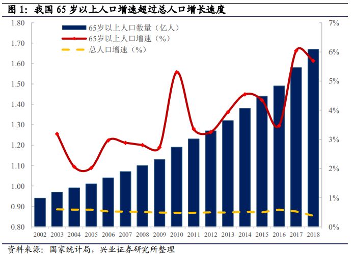 截至2018年底,我国60周岁及以上老龄人口数达到2.49亿,占总人口比重的17.9%,其中65周岁及以上老龄人口1.66亿,占总人口比重的11.9%。我国的老龄化进程正以每年新增1000万人的速度快速发展,预计2020年65岁及以上老年人口占比将达14%,整体步入深度老龄化社会。据世界卫生组织预测,到2050年,中国将有35%的人口超过60岁,成为世界上老龄化最严重的国家。