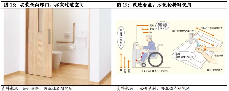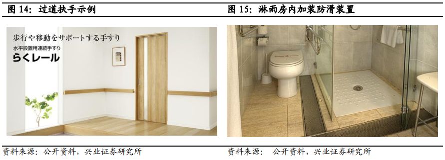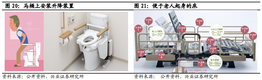 “自己能做的事自己做”是日本对于养老最简单的出发点。日本的适老设施从公共空间一直延伸至老年人家中的各个角落。以居家适老设施为例,家中更方便老人的设施设备,能够帮助老年人更加独立自主生活、方便老年人生活、维持老年人的生活尊严,同时帮助老年人保持身体机能健康。