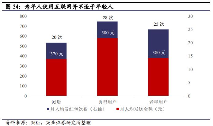 从2016年微信公布的数据来看,55岁以上的微信用户使用微信红包的比重达到了64.6%,每月平均发送微信红包次数为25次,与微信的典型用户的28次不相上下。老年人春节发送红包的金额平均为380元,与95后发红包的金额几乎相同。