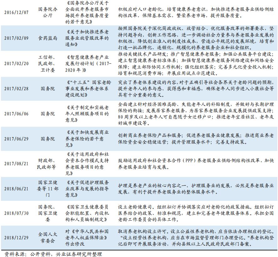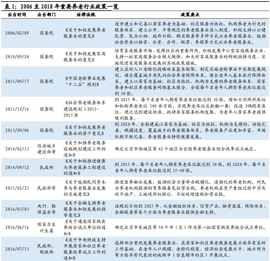 2011年后国家更加密集地颁布关于养老及养老市场方面的政策。2011年至2015年国家共颁布了养老方面相关政策11篇,导向明确、力度加大。2016年国家层面就出台了7项政策,覆盖了养老服务业、社区养老、规范养老服务市场等诸多方面。从2000年左右鼓励发展,到2015年鼓励民营资本进入,定量养老服务设施建设,再到2016年确定北京市东城区等50个市(区)作为第一批国家级医养结合试点单位、2016年12月印发《关于全面放开养老服务市场提升养老服务质量的若干意见》,国家也清醒地意识到养老服务市场单靠目前的局面无法满足“老有所依、老有所养”的需求,需要依靠市场的有效介入环节供需矛盾。