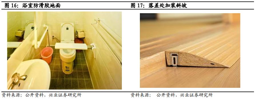 地面防滑处理、减少落差处理:地面防滑处理例如将地板换成更有纹路木质地板、老年人浴室瓷砖地面改造成防滑胶等;减少落差包括在厨房和卫生间有落差的入口处设置斜坡或改造成平面,防止老年人绊倒,方便轮椅出入。