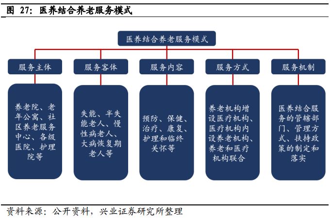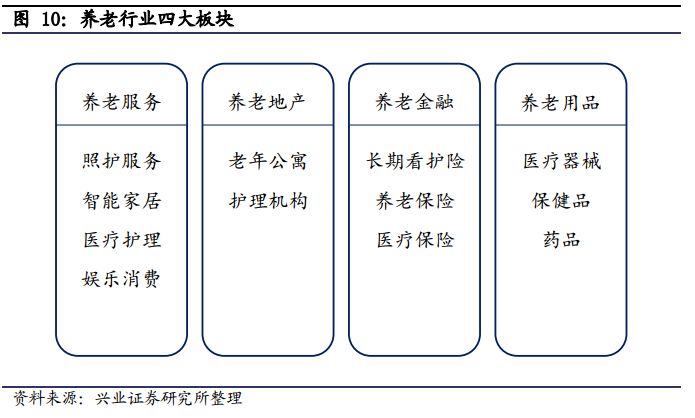养老产业中最重要的部分是为老年人提供养老服务,主要指日常的生活照料和护理服务。此外,还包括提供医疗保健、文化娱乐、旅居养老、智慧养老相关产品等。我们将养老产业分为以下四大板块,即养老服务、养老地产、养老金融和养老用品。
