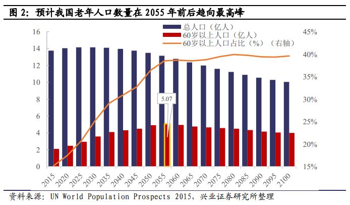 老龄人口在全国人口比重将在未来30年内加速上升。根据联合国2017年的测算,我国60岁以上人口将在2055年左右达到最高峰,预计将达到约5.07亿人,此数值将是2017年数值的近2.1倍。根据测算,同期我国人口可能正处于人口高峰后的下滑阶段,预计总人口数量约13.2亿人,届时60岁以上人口占比将达到38.53%。老龄化问题将在未来几十年间快速激化,2055年后,60岁以上人口占比将趋于稳态。