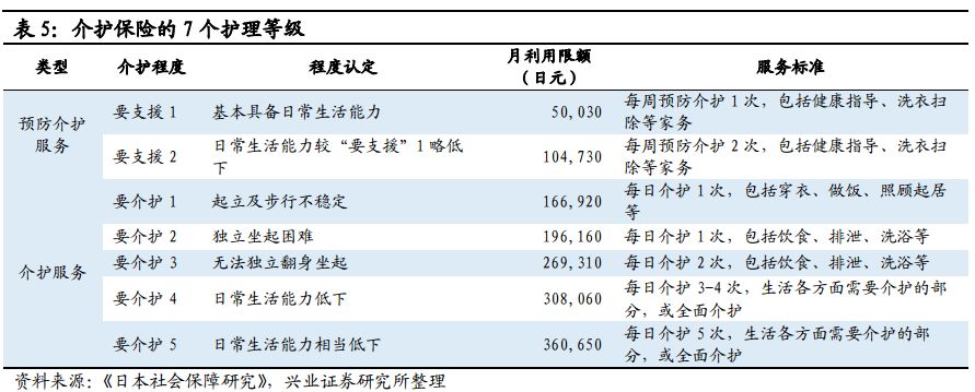 介护保险将老年人需要护理的级别分为7个护理等级,进行区别化和精细化的服务,收费也不尽相同。按老年人的行动能力等情况,将老年人主要分为“要支援”和“要介护”两大类7个小类别,提供的服务包括健康指导、洗衣扫除、帮助饮食、排泄和全方位介护等各个方面。