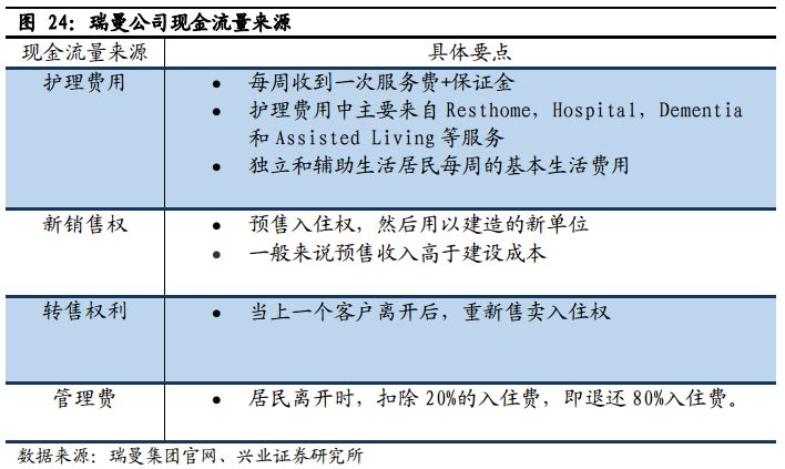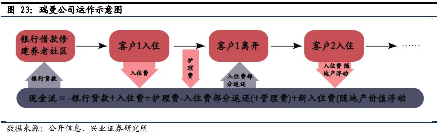 创新的商业模式:集团采用“房地产开发+养老服务”混合体,以“延期管理费”模式运作,保证了公司充足且持续的现金流。入住前村民支付终身入住使用公寓或单位的费用,在迁出后,居民或其遗产收回较部分管理费,一般来说超过五年则收取20%,即客户收回80%管理费。