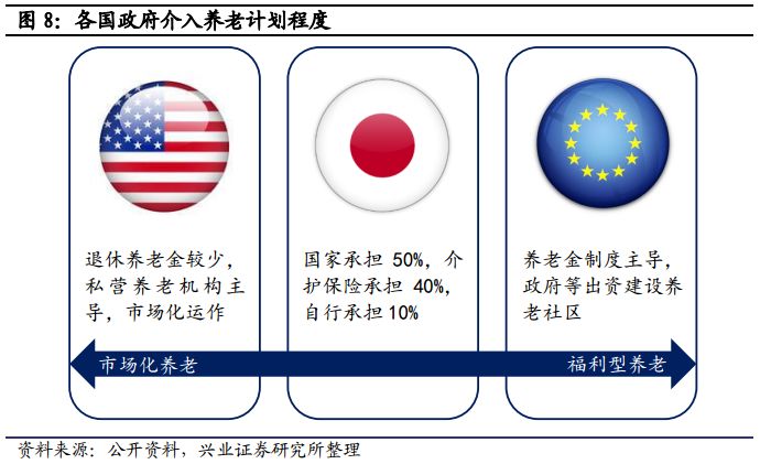 以美国为代表的商业保险模式,国民依靠自己的经济能力和意愿选择适合自己的养老保险和形式。市场化程度高,养老机构主要为民营,自费比例高。