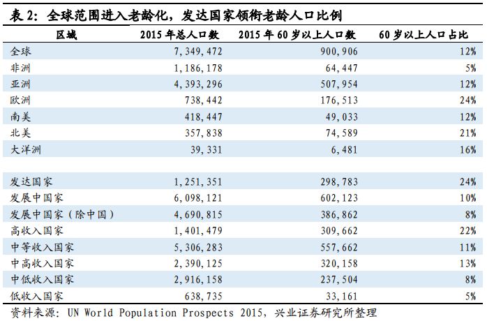 21世纪全球面临的突出问题就是老龄化。根据联合国经济和社会事务署(Department of Economic and Social Affairs)发布的2015年《全球人口前景》,2015年,全球从平均意义上已经进入老龄化社会,60岁以上人口比例已经达到12%,治理老龄化问题已经迫在眉睫。