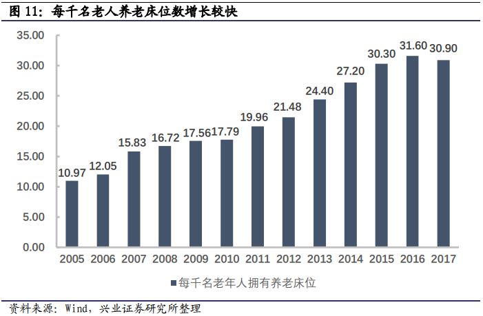 从数量上来看,根据民政部统计,2017年全国包括城市养老机构、农村养老机构和社区养老机构的各类机构数量约6.8万家;各类养老床位745万张,比上年增长仅2%。过去五年中,养老服务床位数由493.7万张增长到744.8万张,年均增长9%。2017年,我国每千老人床位数为30.9张,比上年减少了0.7张,主要原因除去总床位数增长放缓外,2017年人口结构中65岁以上老人较前一年增长了0.6%,远高于之前五年年均增长0.3%的水平。可见,供给增加乏力的同时老龄化需求加速上升,由此导致了巨大的市场缺口。