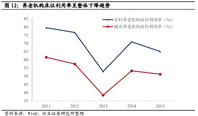 另一方面,全国养老机构的床位利用率并不乐观,养老资源出现一定程度的错配。从民政部数据看,农村和城市的养老机构的床位利用率从2011年后在波动后出现下降。农村养老机构的床位利用率从2011年的79.5%下降至2015年的65%,城市的床位利用率由2011年的61.5%下降至2015年的51.2%。