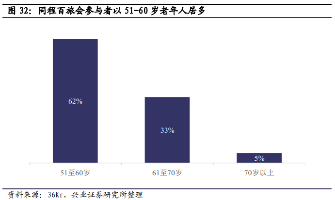 同程旅游的老年旅游品牌“百旅会”中,“较年轻”的老年人是消费主力。根据百旅会的数据,62%的消费者为51至60岁的人群,也有33%的人群在61至70岁之间。